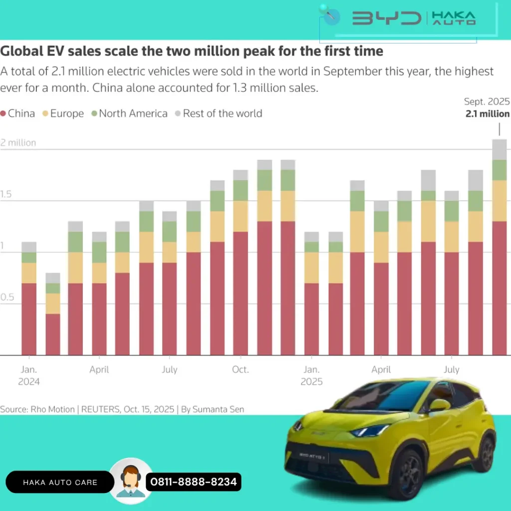 Pasar kendaraan listrik global kembali menorehkan sejarah. Menurut riset terbaru dari lembaga Rho Motion, penjualan mobil listrik murni (BEV) dan plug-in hybrid (PHEV) pada September 2025 menembus rekor baru: 2,1 juta unit melonjak 26 persen dibanding periode yang sama tahun lalu.